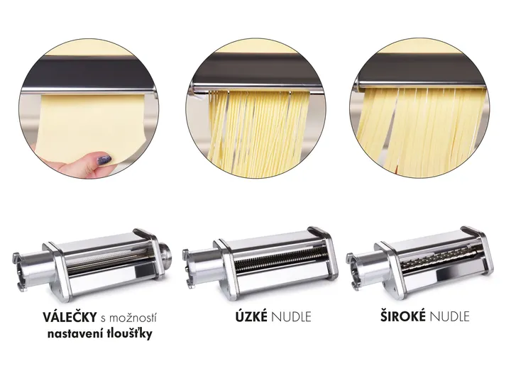 2+1 ZADARMO výrobník na cestoviny, 3 nástavce na výrobu domácich cestovín (široké rezance, úzke rezance, pláty s možnosťou nastavenia ich hrúbky). Materiál: kvalitná nerezová oceľ.