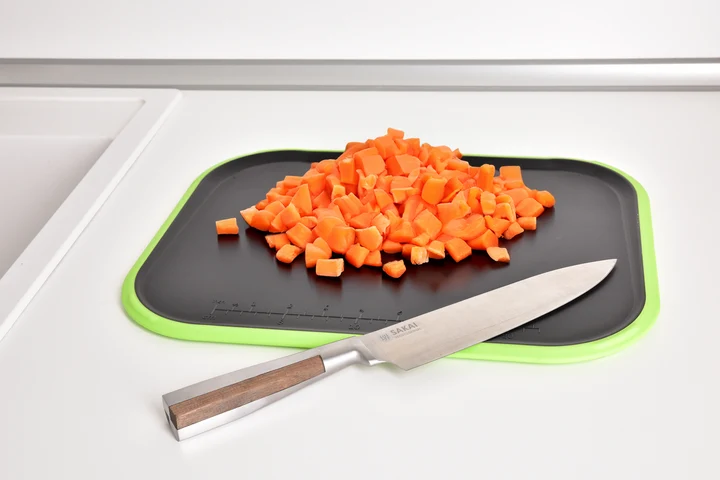 - Stabilita a pevný úchop: Okraj dosky je obklopený gumou a zaistí tak stabilitu a pevný úchop pri krájaní. Vďaka tomu môžeš presne a bezpečne krájať ingrediencie.