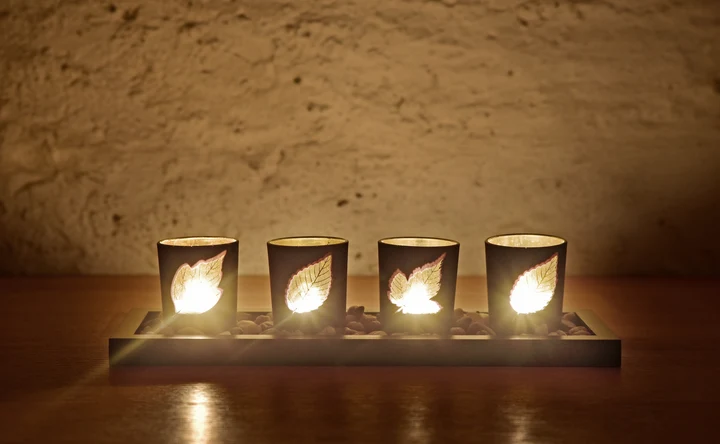 - LUMILEAF sada 4 svietnikov na drevenom podstavci