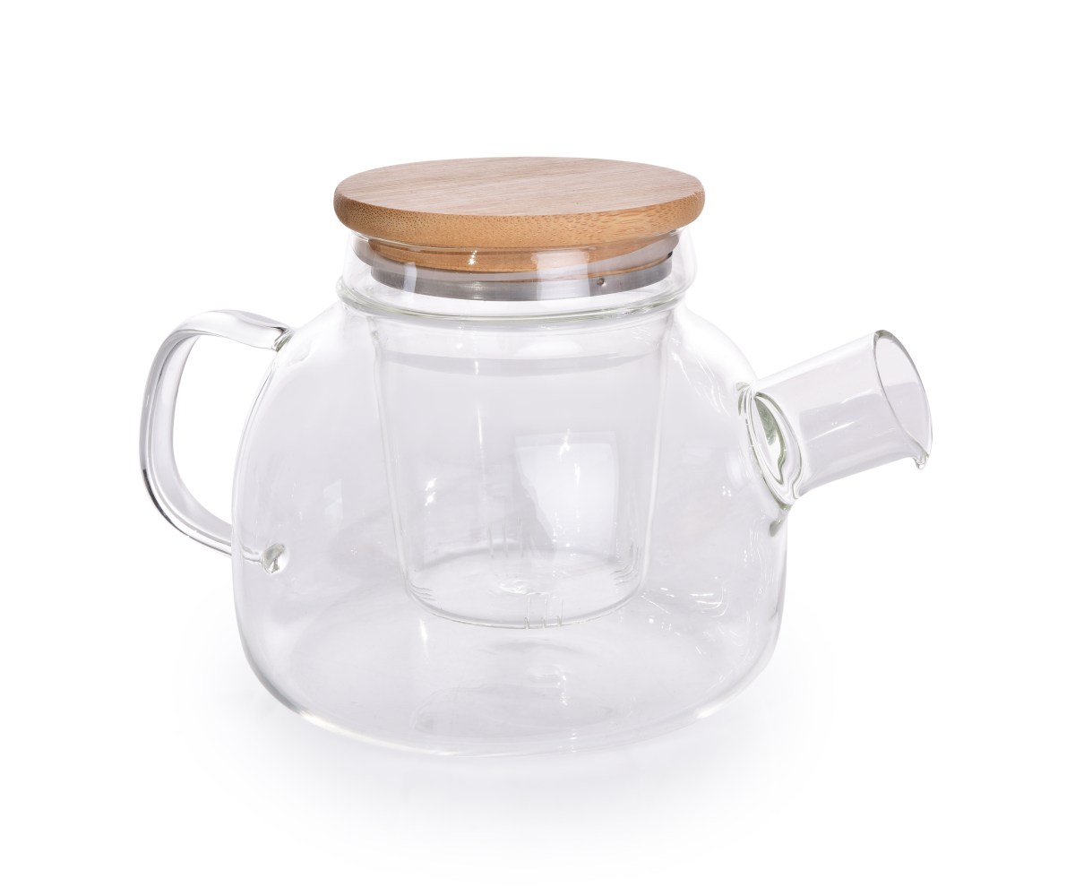 750 ml sklenená kanvica vyrobená z borosilikátového skla s bambusovým viečkom so silikónovým tesnením, vo vnútri skleneného sitko.
