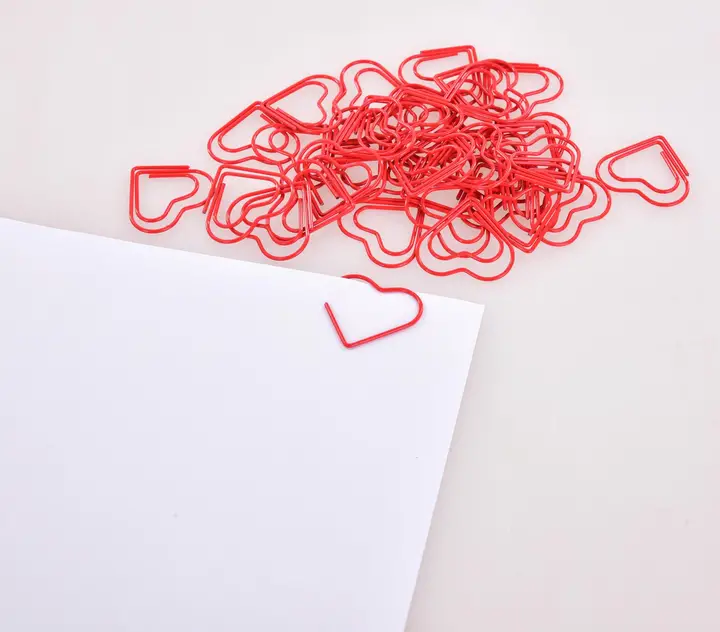 OFFICE balenie 40 ks dekoratívnych kancelárskych sponiek v tvare srdca. Červené kovové sponky pre dokumenty, darčeky alebo kreatívne tvorenie. Štýlový doplnok do kancelárie aj diára. Pevné, znovu použiteľné a výrazné.