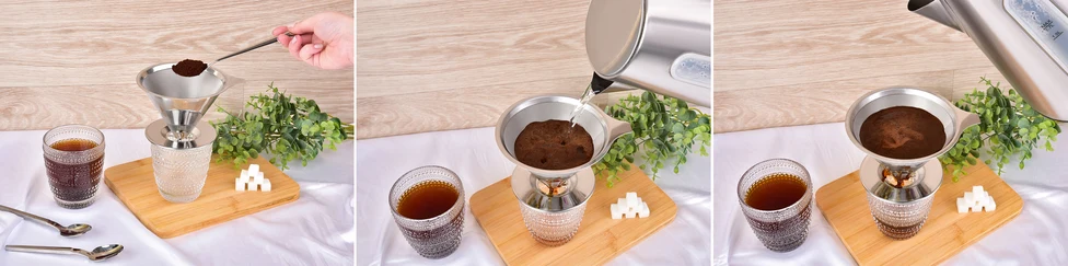 Spodná rozšírená časť dobre padne na šálky, hrnčeky aj kanvice s priemerom 5,5 - 9,3 cm. Praktické držadlo uľahčí manipuláciu, pridržanie filtra pri zalievaní vodou. Je vyrobený z nerezu, je možné ho opakovane použiť.