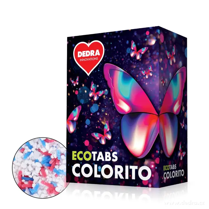 COLORITO ECOTABS sú moderné tablety na pranie farebnej bielizne s aktívnou bioenzymatickou silou. Vďaka inovatívnemu komplexu CPF 12 chránia farby pred vyblednutím a pritom účinne odstraňujú aj odolné škvrny – krv, pot, tráva, omáčky, ovocie ai. Výsledkom je čistá bielizeň a plná, svieža farby.