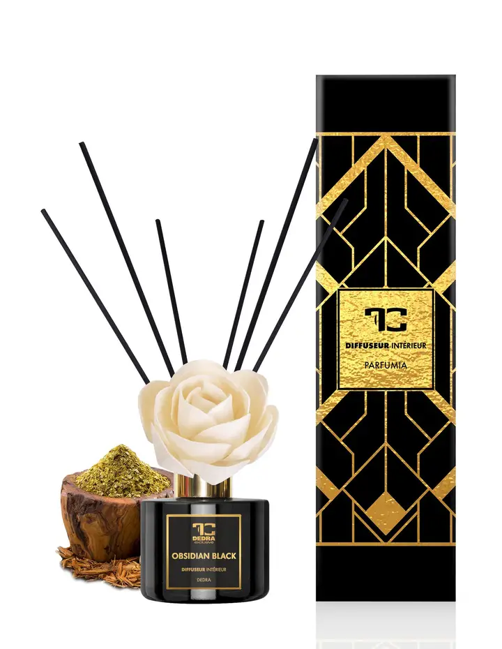 Interiérový bytový parfém, OBSIDIAN BLACK, DIFFUSEUR INTÉRIEUR, objem 200 ml, súčasťou balenia je kvetina FLOW + difúzne tyčinky.