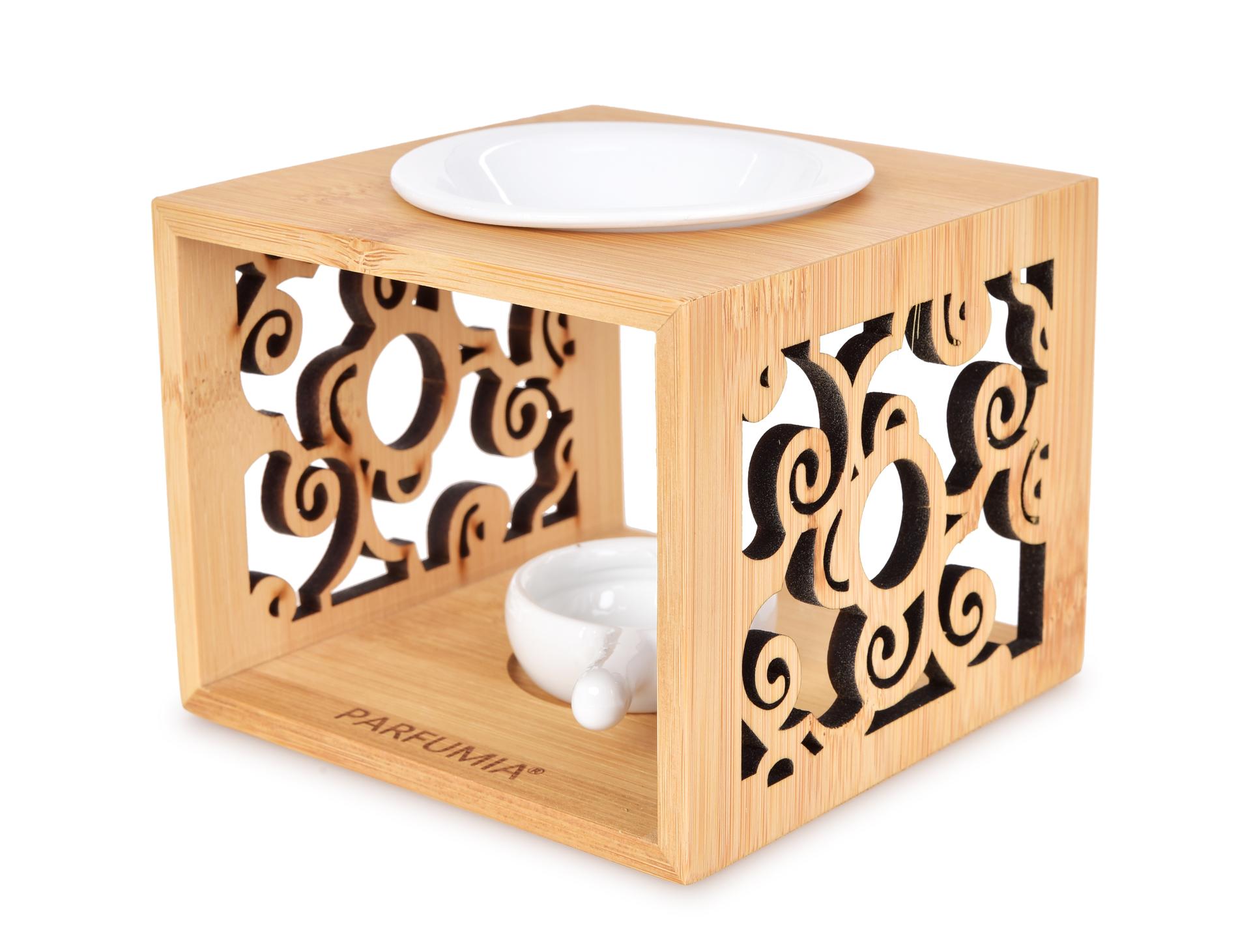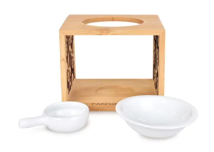 ![]() | Keramická aromalampa PARFUMIA® umiestnená na drevenom stojane.