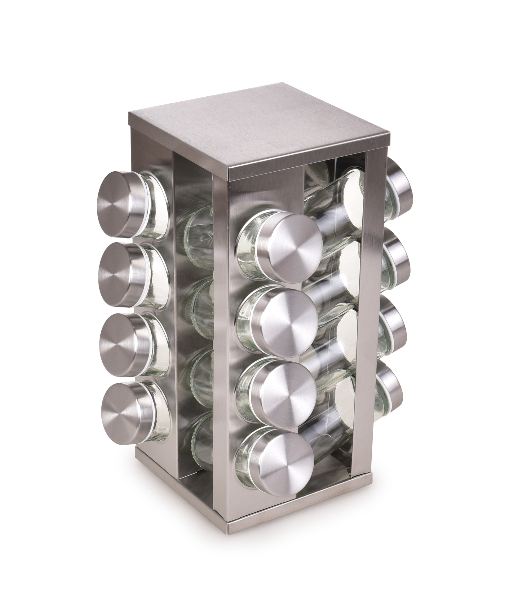 KORENIČKOVÝ KOLOTOČ otočný stojan z brúsenej nerezovej ocele so sklenenými koreničkami.