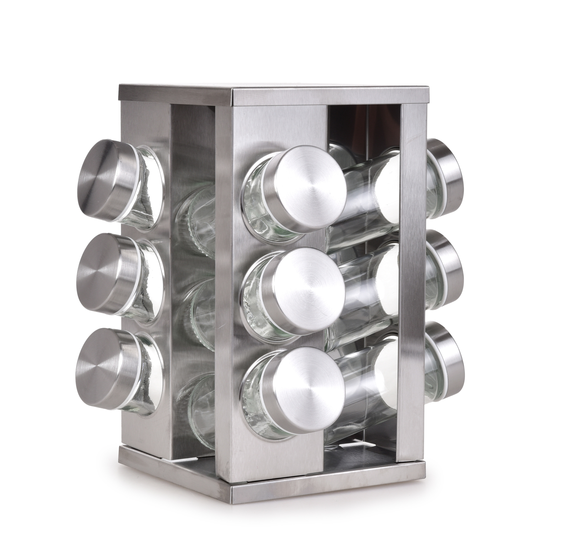 KORENIČKOVÝ KOLOTOČ otočný stojan z brúsenej nerezovej ocele so sklenenými koreničkami.