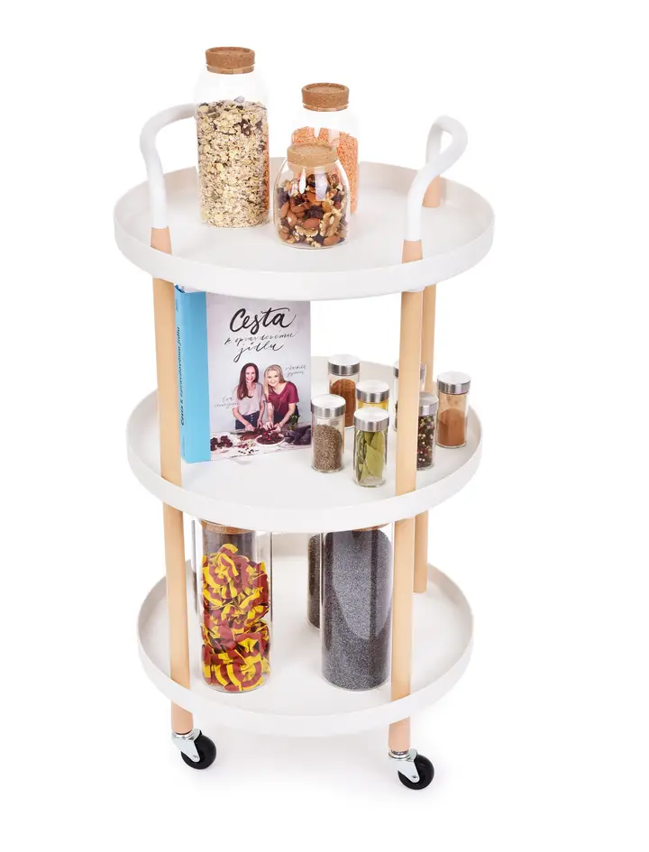 Pojazdný poschodový regál MULTI-TROLLEY so 4 kolieskami v spodnej časti (možno zafixovať proti pohybu), pevné kovové madlá pre ľahkú manipuláciu, okrúhly 3 poschodový. Rozmery: priemer 47,5 cm, v 86 cm. Materiál: kov a plast.