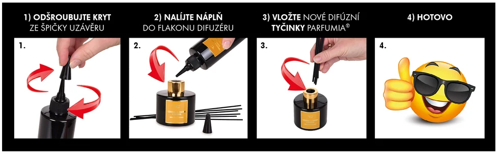 - Zhruba po týždni alebo podľa svojej nálady odporúčame tento postup „obracania tyčiniek vo fľaštičke“ zopakovať. Chystá sa k vám návšteva? Otoč tyčinky. Tým sa vôňa zintenzívni a rozprestrie po celej miestnosti.
