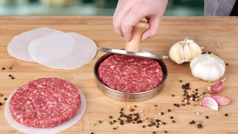 HAMBÁTOR lis na hamburgery s drevenou rukoväťou pre ľahké uchopenie.