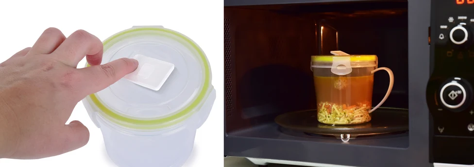 | KOLÍSKOVÝ VENTIL na ohrievanie s vekom. Stačí stlačiť ventil a vložiť nádobu aj s vekom do mikrovlnky. |