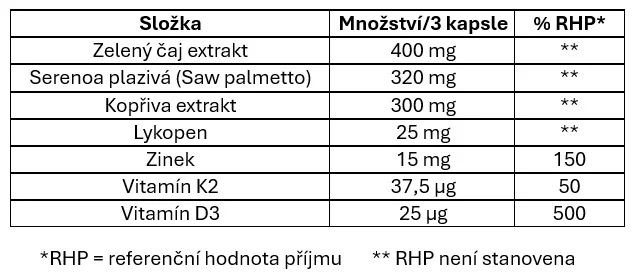 Zloženie: lykopén z paradajok, zelený čaj extrakt z listu 75%, serenoa plazivá (saw palmetto), žihľava dvojdomá extrakt z vňate, zinok (bisglycinát zinočnatý), protispekavá látka: stearát horečnatý, vitamín K2 (menachinón MK-7), vita.