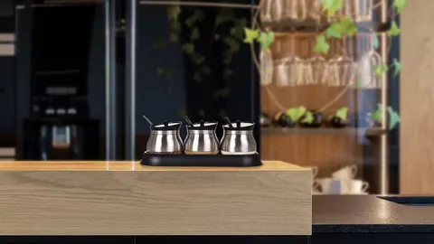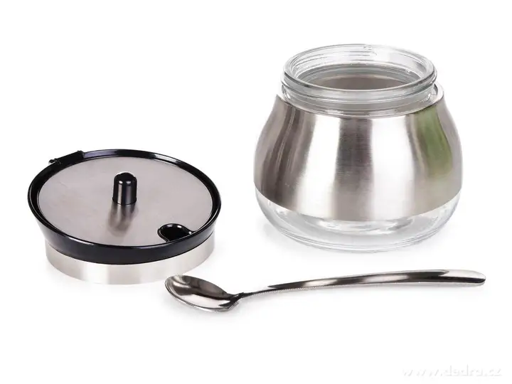 Servírovacia sada z odolného borosilikátového skla s nerez povrchom a nerez lyžičkou a to všetko na podstavci.