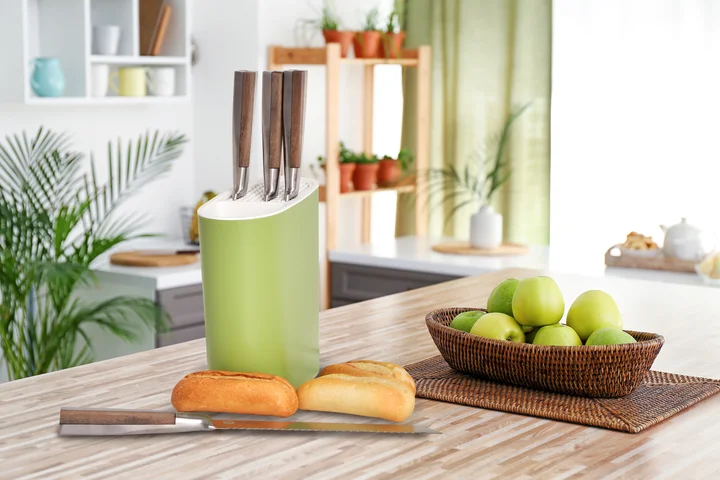 Špeciálne navrhnuté drážky umožňujú umiestniť nože vo zvislej polohe, čím sa predchádza ich poškodeniu a strate ostrosti.