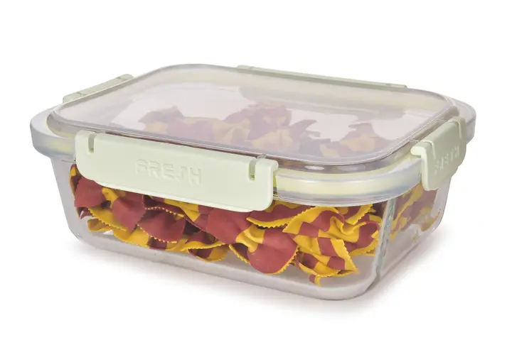 ![]() | Sklenená dóza na potraviny FRESH GLASS, veko so silikónovým tesnením a 4 klipsy pre pevné uzatvorenie.