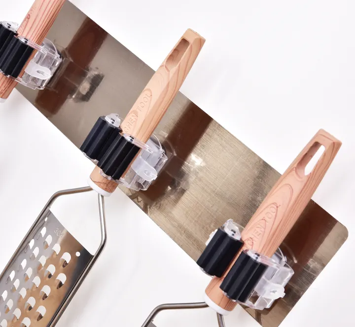 - Bezpečné uloženie: Držiak umožňuje bezpečné uloženie metiel, nožov, kief a ďalších domácich pomôcok, eliminuje riziko pádu a poškodenia.