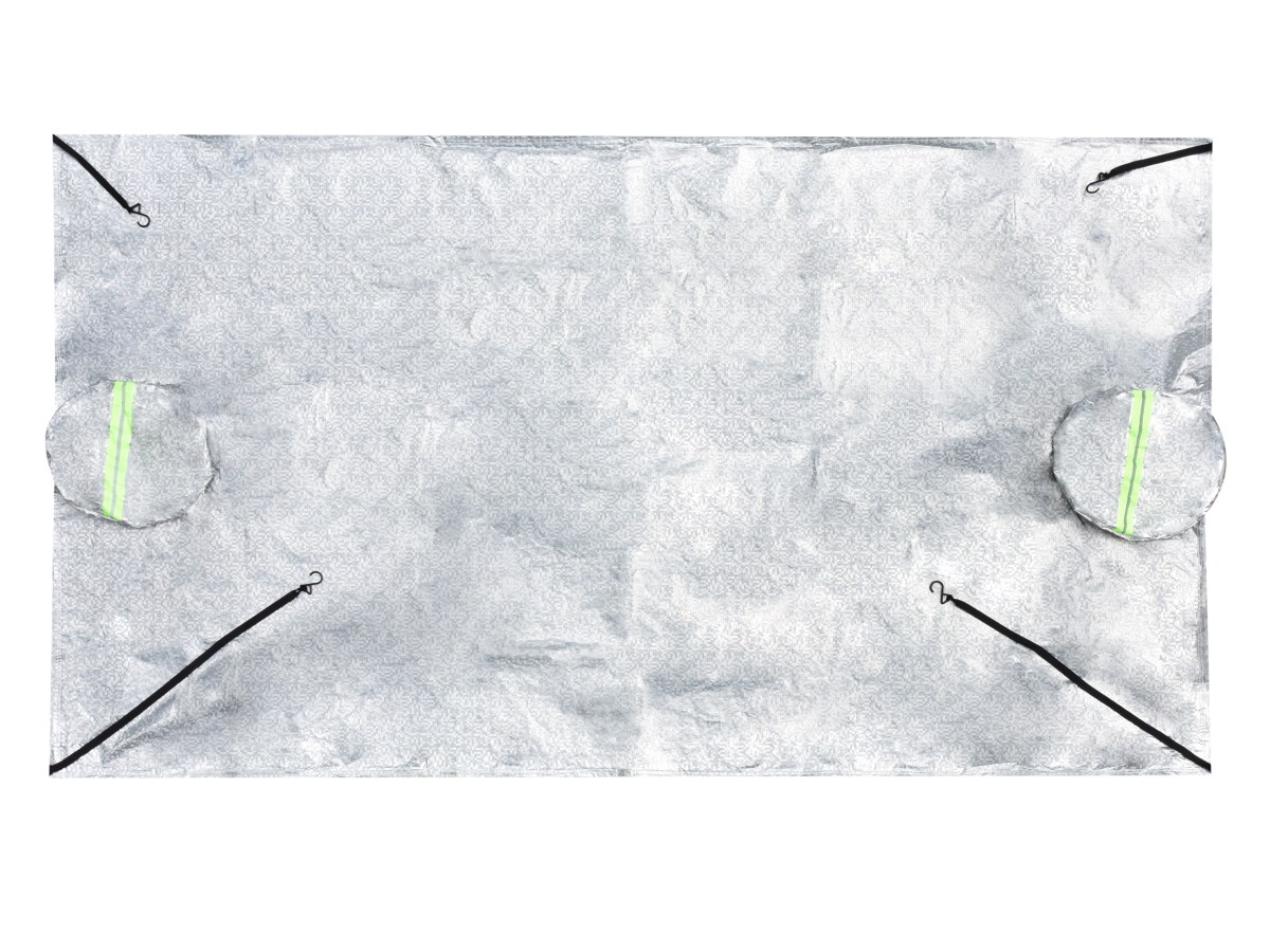 Univerzálna slnečná a mrazová plachta DRIVE na čelné sklo, bočné okná a spätné zrkadlá. Rozmer 245 × 140 cm, Alu povrch, bezpečnostná páska pre lepšiu viditeľnosť. Upevnenie na disky kolies a suchý zips pre pevné držanie. Používaním plachty zabrániš v lete zvyšovaniu teploty vo vozidle stojacom na slnku av zime vzniku námrazy nielen na čelnom skle.